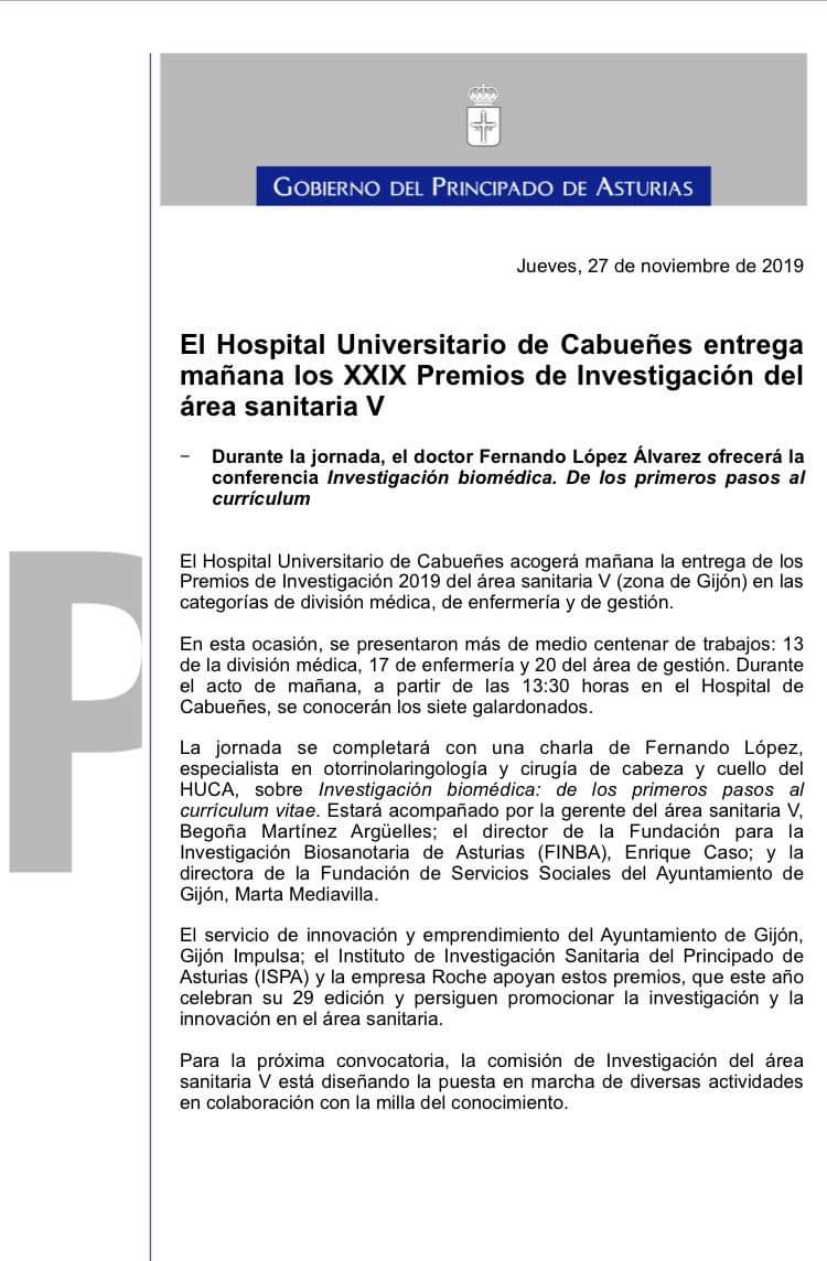 El Hospital Universitario de Cabueñes entrega hoy los Premios de Investigación 2019 del área sanitaria V (zona de Gijón) en las categorías de división médica, de enfermería y de gestión.